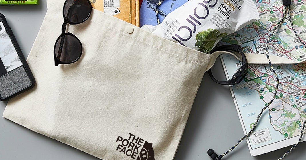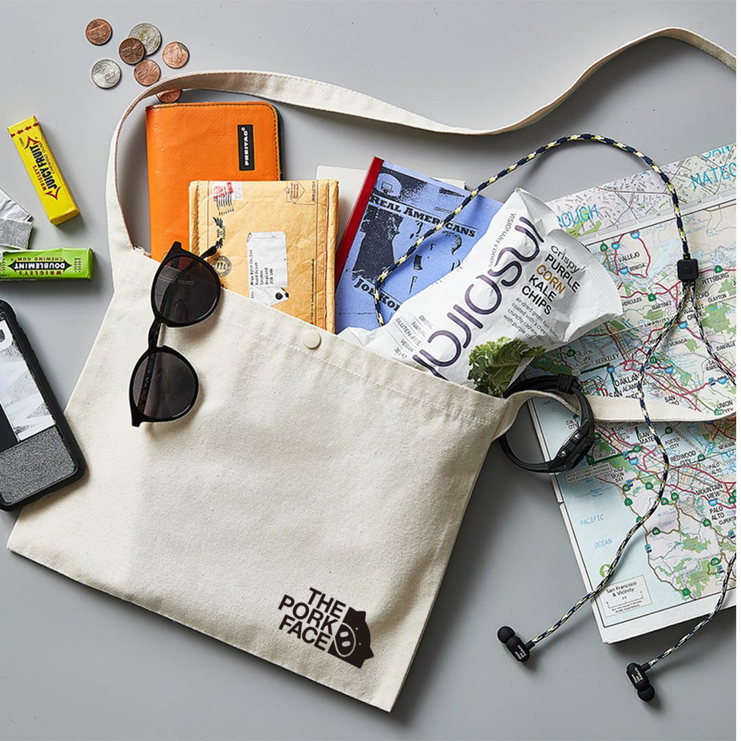 280/㎡のレギュラーキャンバス生地を使用したサコッシュにTHE PORK FACEのプリントを施しました。。サイクリング、旅行などのアクティブシーンにとても便利です。マチがなくシンプルな袋状で、普段持ち歩く小物を入れるのにちょうどよいサイズ、袋口スナップボタン付です。