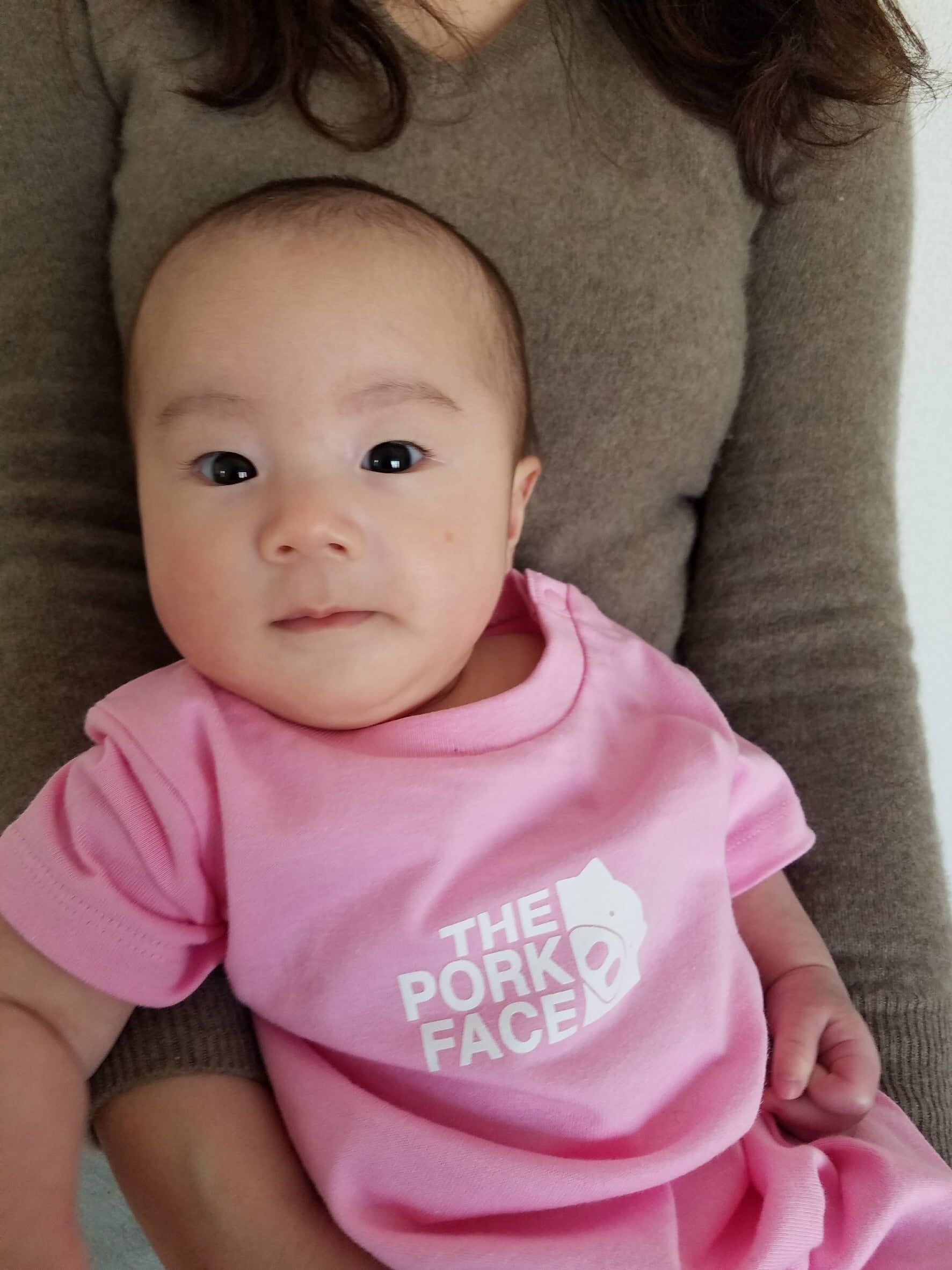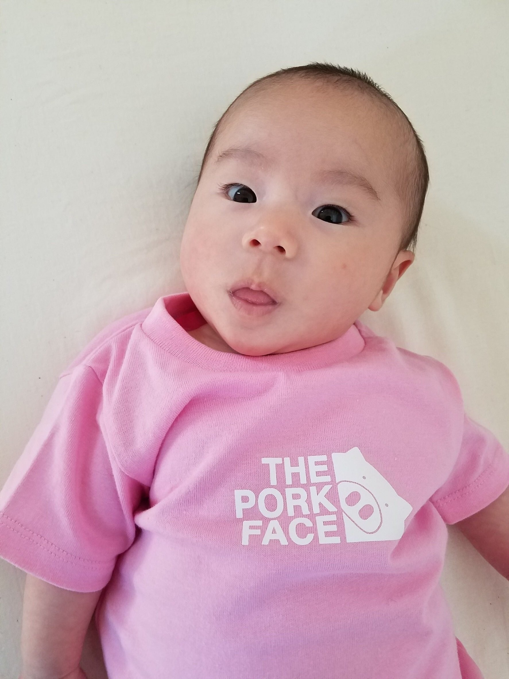 5.6ozのロンパースにTHE PORK FACEのロゴをプリントしました。